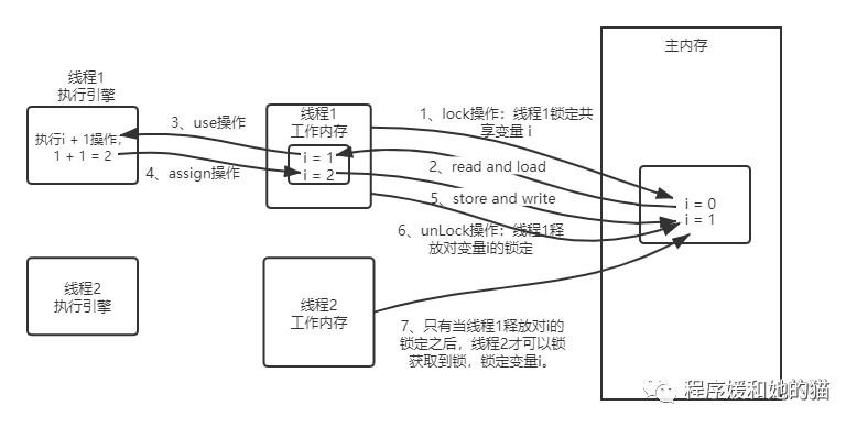 不允许read和load、store和write操作之一单独出现,也就是不允许从主内存读取了变量的值但是工作内存不接收的情况,即执行了read,不执行load。或者不允许从工作内存将变量的值回写到主内存但是主内存不接收的情况,即执行了store,不执行write。 不允许一个线程丢弃最近的assign操作,即不允许线程在自己的工作内存中修改了变量的值却不同步回主内存。 不允许一个线程回写没有修改的变量到主内存,也就是说如果线程工作内存中变量没有发生过任何assign操作,是不允许将该变量的值回写到主内存的。 一个新的变量只能在主内存中产生,不允许在工作内存中直接使用一个未被初始化(初始化,即load或assign)的变量,也就是说对一个变量实施use、store操作之前,必须先经过assign和load操作。 一个变量在同一时刻只能被一个线程对其进行lock操作,也就是说一个线程一旦对一个变量加锁后,在该线程没有释放掉锁之前,其他线程是不能对其加锁的,但是同一个线程对一个变量加锁后,可以继续加锁。此外释放锁次数必须和加锁次数相同,即多次执行lock后,只有执行相同次数的unlock操作,变量才会被解锁。 如果对一个变量执行lock操作,就会清空工作内存中该变量的值,在执行引擎使用这个变量之前,需要重新执行load或assign操作初始化变量的值。 不允许对没有lock的变量执行unlock操作,如果一个变量没有被lock操作,那也不能对其执行unlock操作,当然一个线程也不能对被其他线程lock的变量执行unlock操作。 对一个变量执行unlock之前,必须先把变量同步回主内存中,也就是说在对一个变量执行unlock操作之前,必须先执行store和write。