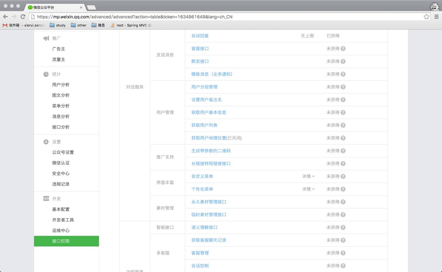 按要求填写基本信息,激活邮箱、验证个人信息等等操作后,注册成功。此时,作为一个最简单的公众号,微信已经给我们了很多相应的权限,在【接口权限】页面中我们可以看到我们所拥有的所有权限: