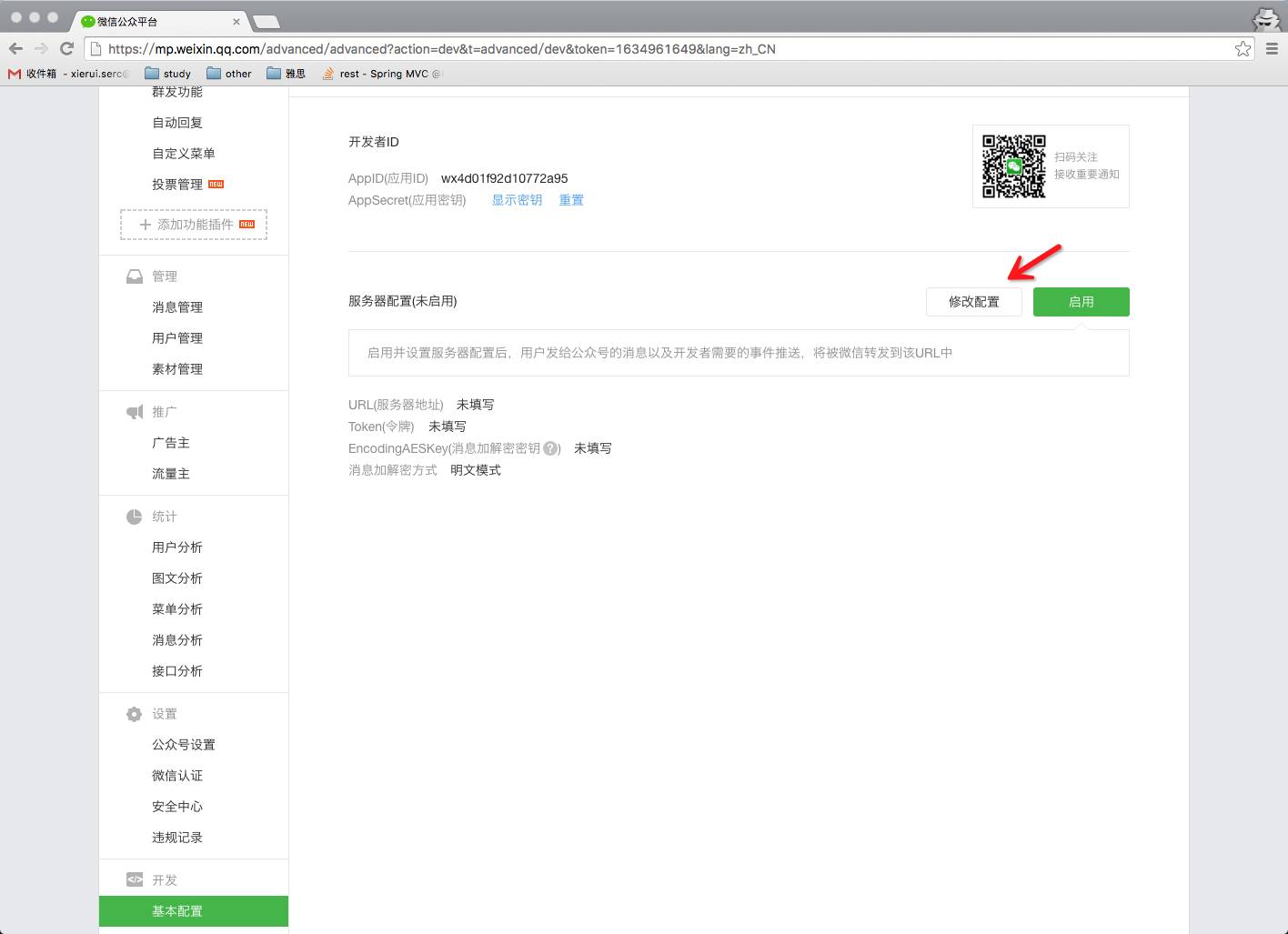 我们可以看到,微信会主动的向你的开发服务器推送相应的消息,很明显,我们需要在微信公众平台中进行相应的设置: