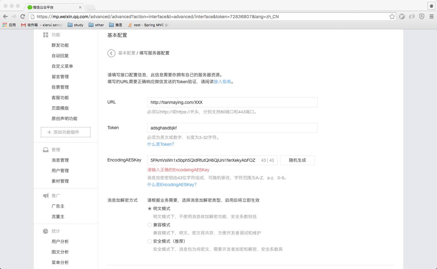 这里,我们根据实际情况将URL、Token、EncodingAESKey填好,直接选择明文模式接收公众号的消息。