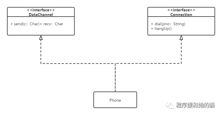 见程序1中的Phone接口(电话接口),刚开始我认为这个接口包含四个职责,即每个方法是一个职责,实际上是包含两个职责,第一个职责是连接管理,第二个职责是数据通信,dial(拨号,打开连接)和hangUp(挂机,关闭连接)函数进行调制解调器的连接处理,send(发送消息)和recv(接收消息)函数进行数据通信。