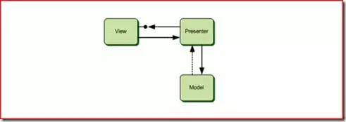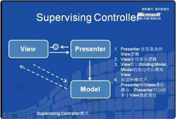 Presenter与Controller一样,接收View的命令,对Model进行操作;与Controller不同的是Presenter会反作用于View,Model的变更通知首先被Presenter获得,然后Presenter再去更新View。一个Presenter只对应于一个View。根据Presenter和View对逻辑代码分担的程度不同,这种模式又有两种情况:Passive View和Supervisor Controller。