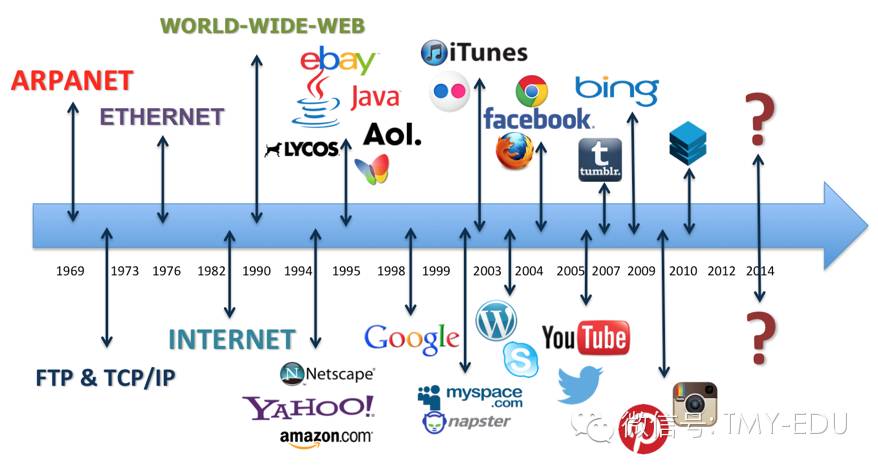 1990年的时候出现了World-Wide-Web,万维网,就是现在简称的Web。大家注意一下这个词,以及它在这张图中的位置。在这个词出现之前,在这张图中都是冷冰冰的技术术语,很多术语非计算机专业的同学可能都没有听过。但是在这个World-Wide-Web出现之后,图中的很多词语都耳熟能详了吧,比如Yahoo、Google和Facebook,这都是互联网发展历史上里程碑式的伟大企业。