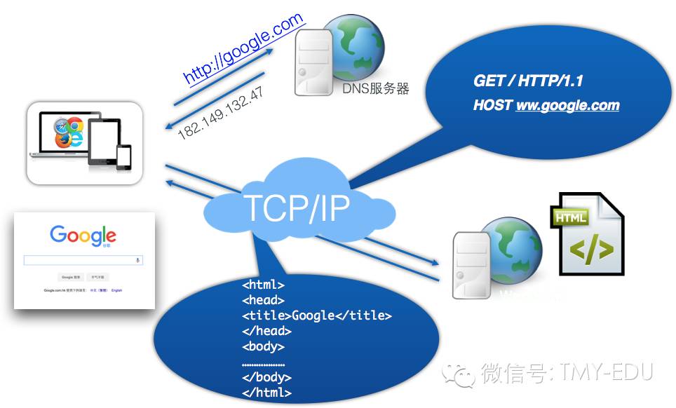 有了IP地址,浏览器就可以基于HTTP协议,向远程的Web服务器发送请求了。而Google的Web服务器就能够接收到这样的请求,收到这样的请求之后,它就会调用后端的一系列功能并且最终组装出HTML页面,通过HTTP协议返回给浏览器。浏览器把返回的HTML文本渲染成为一个美观而且可读的页面,这就是在浏览器中看到Google的页面了。这整个过程是在TCP/IP协议之上完成的,Web请求和Web响应都会安装TCP协议要求的方式进行打包和传输。