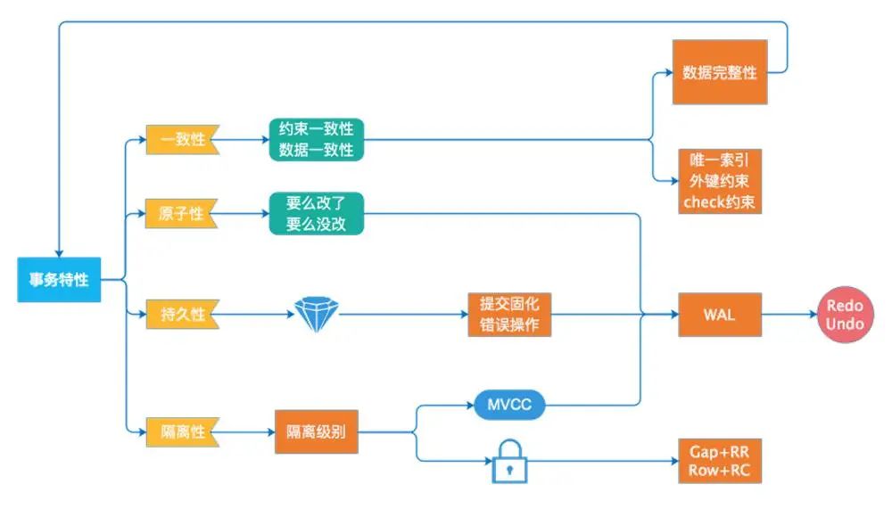 1、原子性(Atomicity):事务中的全部操作在数据库中是不可分割的,要么全部完成,要么全部不执行。不存在拆分开来,部分成功的场景。它不会结束停留在中间某个中间环节。如果事务在执行过程中发生错误,会被回滚到事务开始前的状态,如同这个事务从来没有执行过一样。