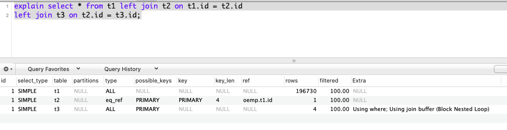 explain select t2.* from t1,t2,t3 where t1.id = t2.id and t1.id = t3.id
