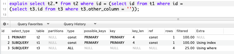 explain select t2.* from (select t3.id from t3 where t3.other_column = '') s1,t2