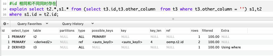 id 如果相同,可以认为是一组的,从上往下执行; 在所有组中,id 值越大,优先级越高,越先被执行; 衍生 = DERIVED