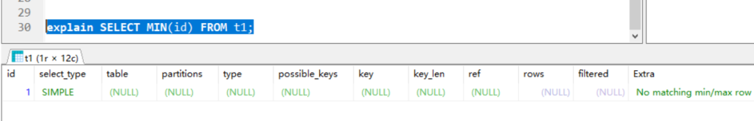 mysql 能够在优化阶段分析查询语句,在执行阶段不用再访问表或者索引。例如:在索引列中选取最小值,单独查询索引来完成,不需要在执行时访问表