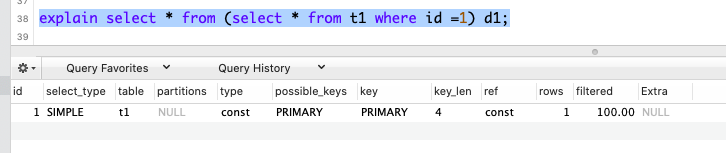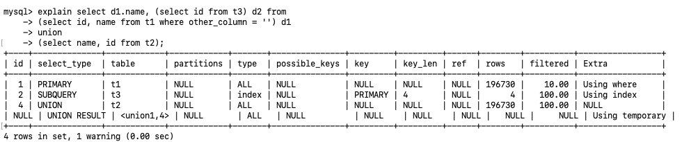 第一行 (执行顺序4):id 列为1 , 表示 union 的第一个 select , select_type 的 primary 表表示该查询为外层查询, table 列被标记为 , 表示查询结果来自一个衍生表,其中 derived3 中的 3 代表查询衍生自第三个 select 查询, 即 id 为 3 的 select [select d1.name ... ] 第二行(执行顺序为2):id 为 3 ,是整个查询中第三个 select 的一部分, 因查询包含在from 中, 所以为derived 。【select id, name from where other_column = ''】 第三行(执行顺序为3):select 列表中的子查询 select_type 为 subquery , 为整个查询中的第二个 select . [select id from t3] 第四行(执行顺序为1):select_type 为 union , 说明第四个 select 是 unin 里的第二个 select , 最先执行 【select name ,id from t2】 第五行(执行顺序为5):代表 union 的临时表中读取行的阶段, table 列的 <union , 1, 4> 表示用第一个 和第四个 select 结果进行union 操作 。【两个结果 union 操作】