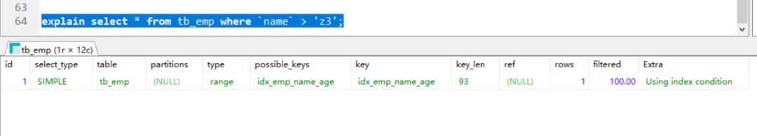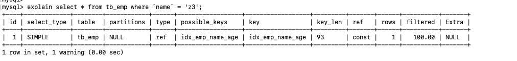 表示索引中使用的字节数,可通过该列计算查询中的使用的索引的长度,在不损失精确性的情况下,长度越短越好 key_len 显示的只为索引字段的最大可能长度,** 并非实际使用长度**。即 key_len 是根据表定义计算而得,不是通过表内检索出的。 查询结果: