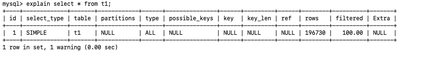 类型:all , index , range, ref, eq_ref, const, system ,null type 显示的是关联类型或者访问类型,是较为重要的一个指标,结果从好到坏依次是: system > count > eq_ref > range > index > all