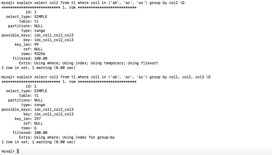 explain select col2 from t1 where col1 in ('ab', 'ac', 'as') group by col2 \G;
