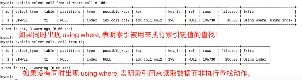 表示相应的 select 操作使用了覆盖索引 (Covering Index), 避免了访问表的数据行,效率不错~ 如果同时出现 using where , 表示索引被用来执行索引键值的查找;如果没有同时出现 using where , 表明索引引用来读取数据而非执行查找动作。例子: