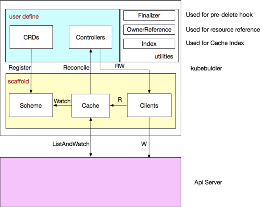 Kubebuilder 为 Operator 代码库中涉及的各种组件(如 CRD 和 Controller-API)的代码生成提供了快速教程和简单的脚手架,其架构如下所示: