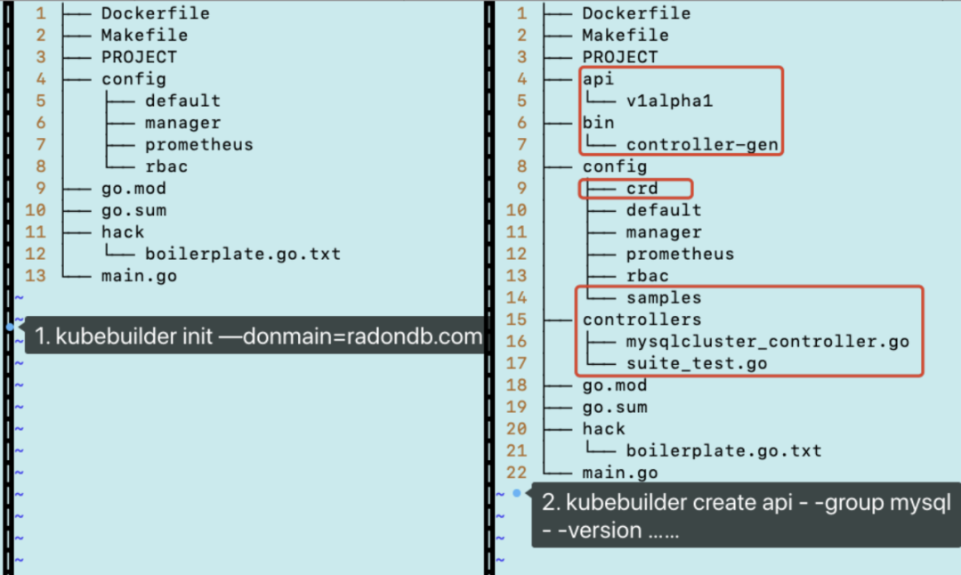 通过两条指令生成的文件目录对比,执行第二条指令后,多了 api 目录,crd 目录以及 controllers 目录。