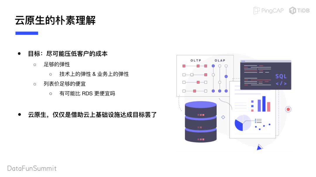 云原生是一个比较新的概念,TiDB有在云上为客户提供PaaS服务的业务。客户实际上需要的不是云原生,客户需要的是尽可能压低使用服务的成本。这里成本指的是综合成本,不只是资源成本。
