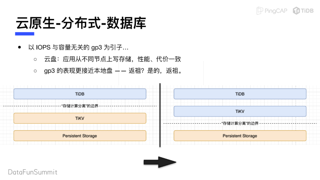 既然提到“返祖”,那么TiDB的架构演进上可不可以也“返祖”呢?我们来考虑一下把“存算分离”的边界从TiDB-TiKV之间,移动到TiKV和持久化存储之间。