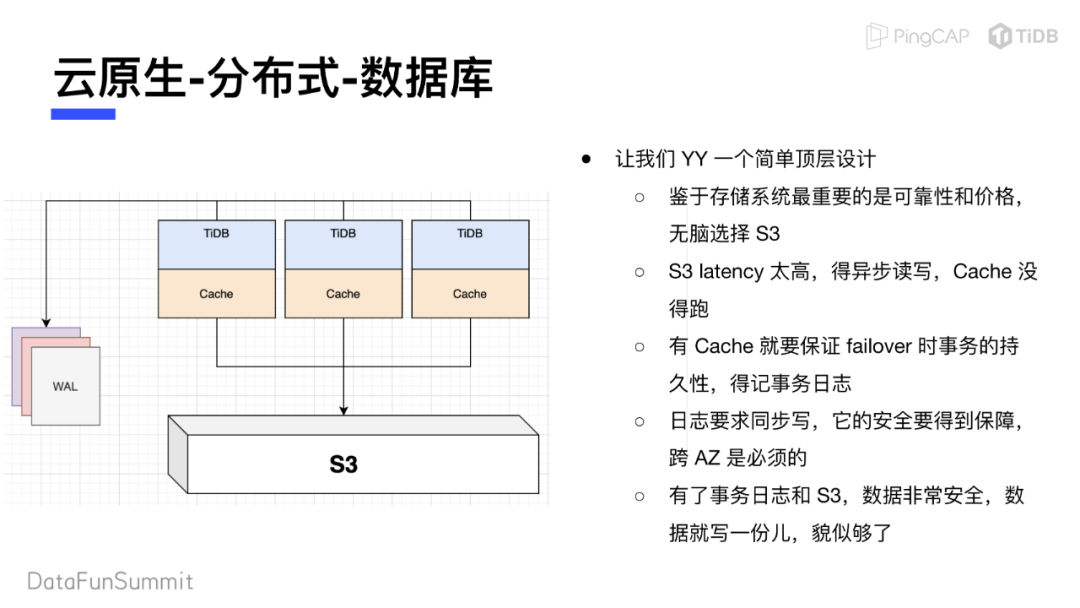 有了缓存,就意味着数据存储了两份,一份是缓存数据一份在S3中持久化存储。OLTP数据库的特征是需要保持数据的持久性,在发生故障时可以恢复数据,因此要记录事务日志。当一个TiDB节点挂掉后,利用S3上持久化存储的数据配合事务日志就可以做到数据恢复。