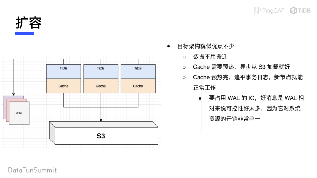 缓存加载完成、事务日志同步数据过程执行完成后,扩容的节点就可以正常工作。虽然事务日志同步数据的过程需要占用WAL集群的IO,但WAL系统资源开销单一、性能消耗也更容易预测,可控性方面相比于直接控制TiKV集群好很多。
