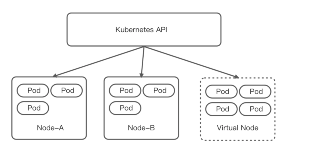 为了解决上述问题,我们考虑将定时任务 pod 和普通在线服务的 pod 隔离开,但是由于很多定时任务需要和集群内服务互通,最终确定了一种将定时任务 pod 在集群内隔离开来的解决办法 —— K8s serverless。我们引入了虚拟节点,来实现在现有 K8s 体系下使用 K8s serverless。部署在虚拟节点上的 pod 具备与部署在集群既有节点 pod 一致的安全隔离性、网络连通性,又具有无需预留资源,按量计费的特性。如图所示: