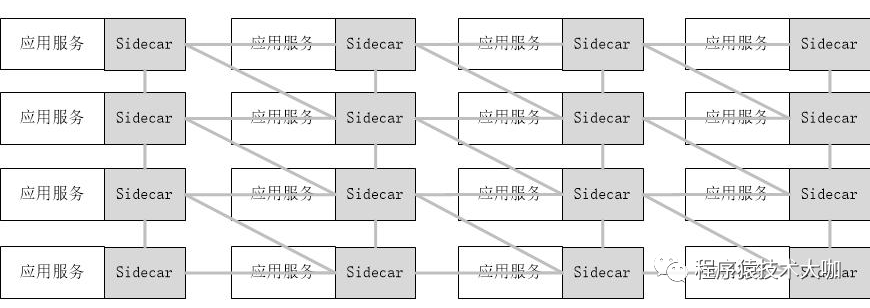 Sidecar代理,完成服务间复杂的通信,最终就会得到一个如下图所示的网络拓扑结构,这就是