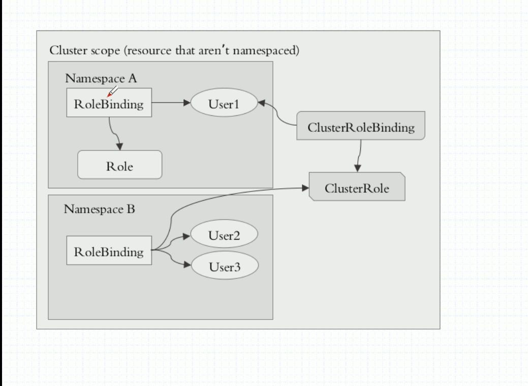 每个名称空间下,user都通过rolebinding绑定role,定义一个ClusterRole拥有集群级别的操作权限,通过ClusterRolebinding与user绑定,该用户user就有了集群级别的操作权限