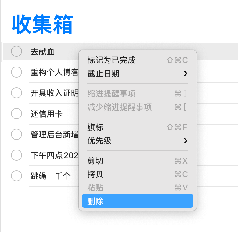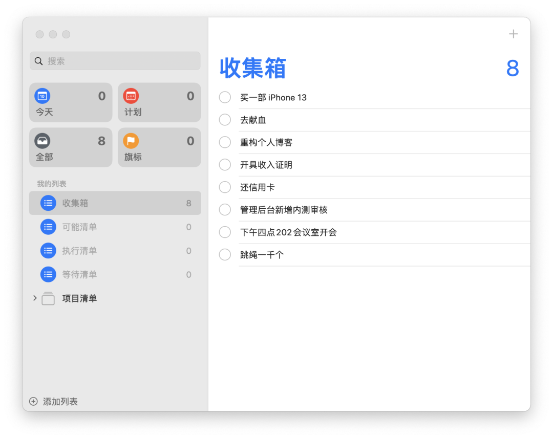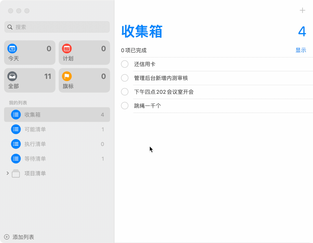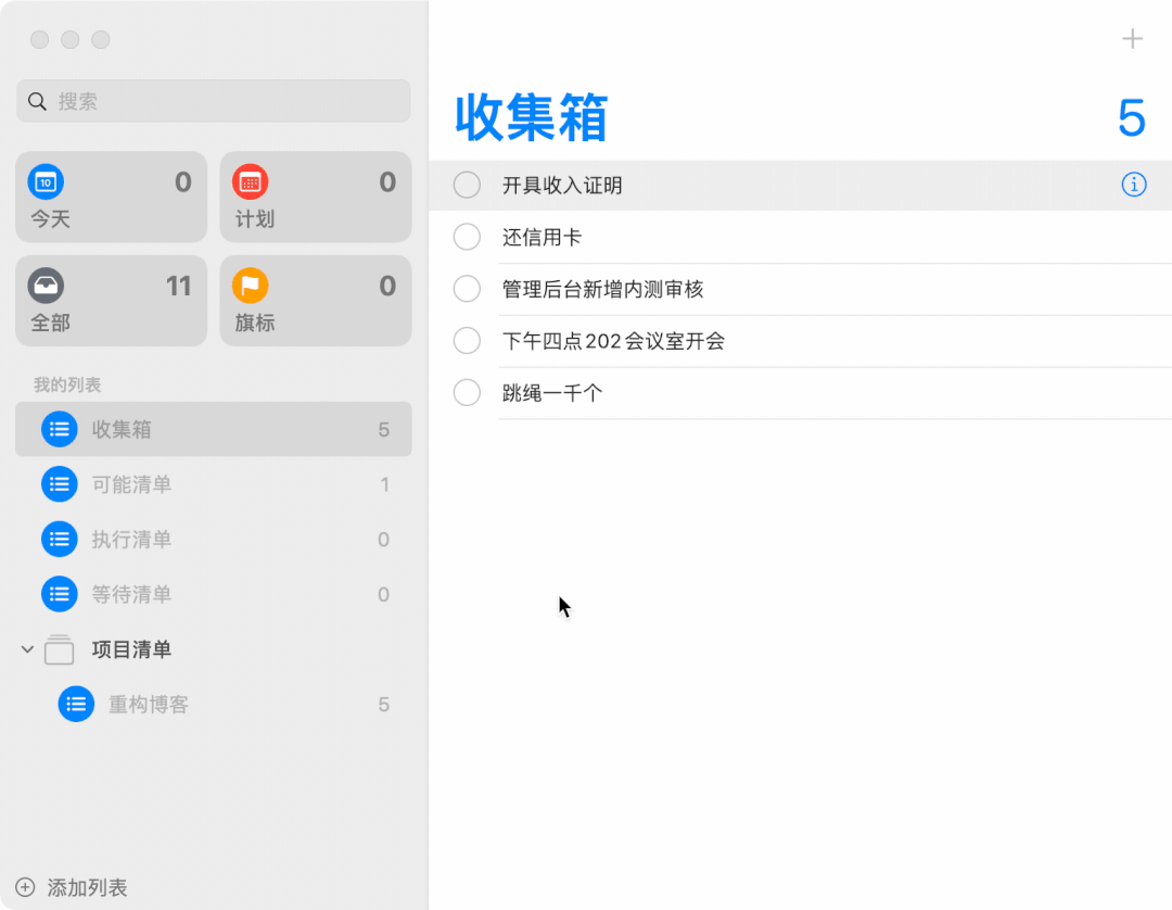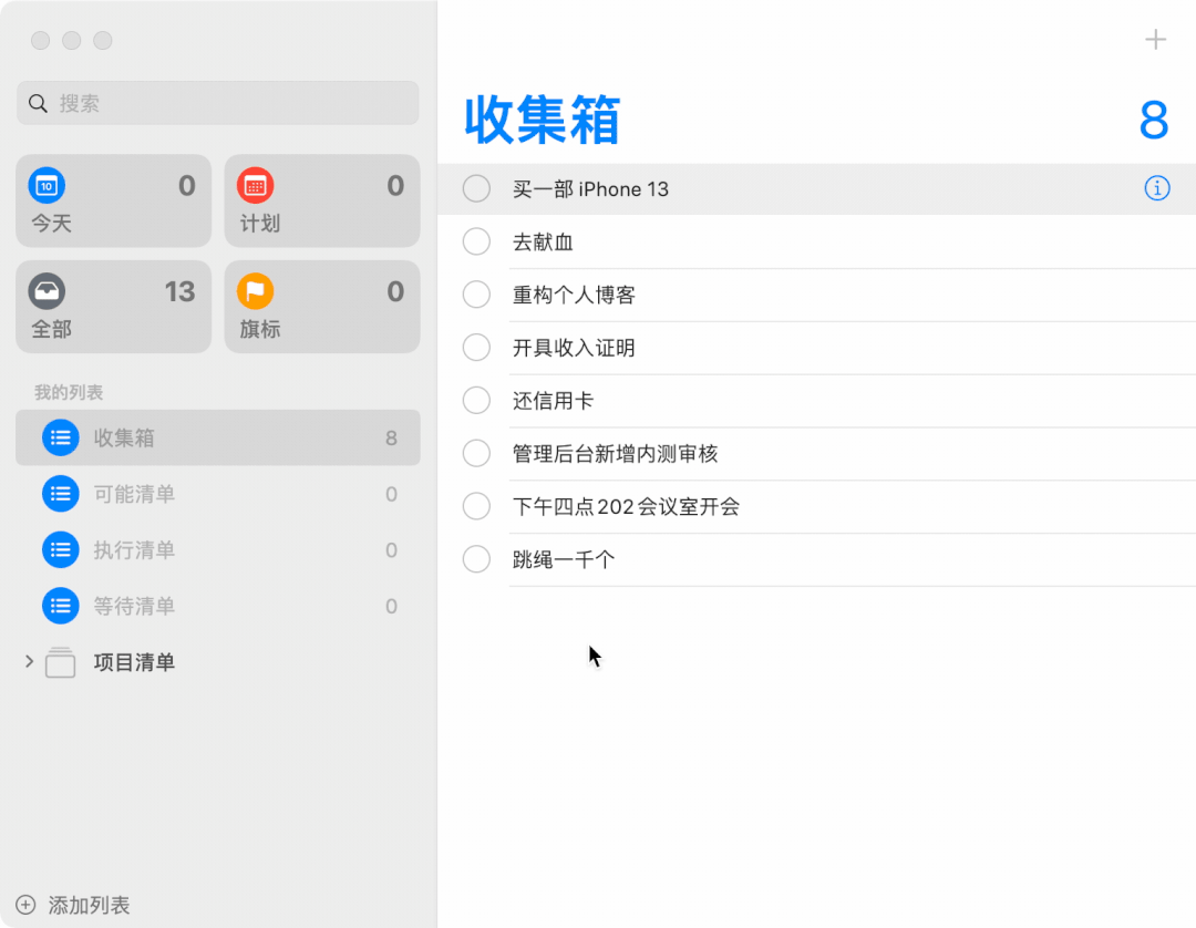 将大脑清空的方法就是把脑袋里的所有的事情全部倒出来,不管轻重缓急还是是否在进行中。把所有的事情收集起来,可以使用便利贴、本子,或者直接记录在手机的备忘录上。当然,也可以使用专业的工具,比如 mac 上面自带的提醒事项。
