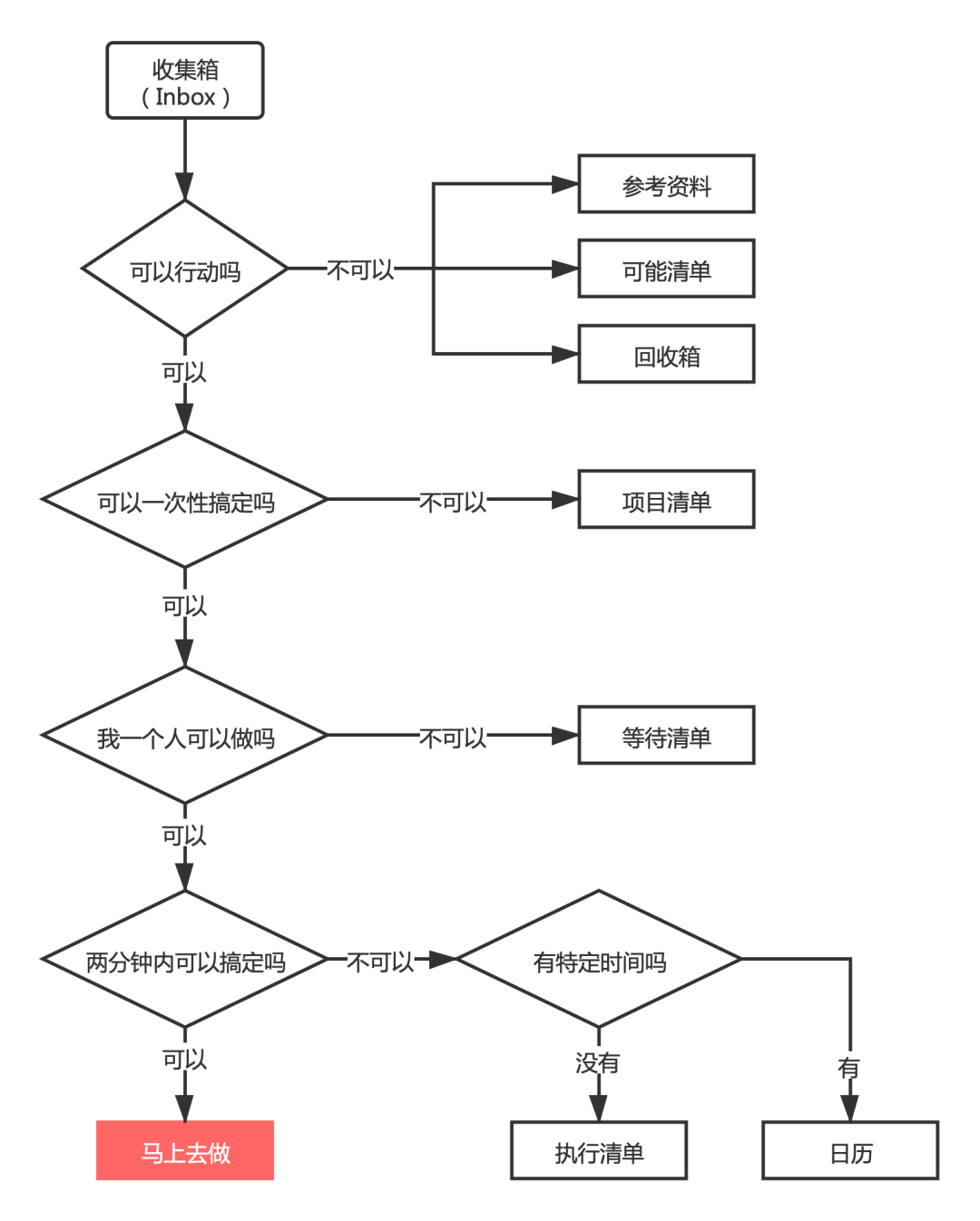 把所以的事情放到了收集箱之后,我们就需要来处理这些事情,按照一个科学的方法进行归类。而 GTD 就提供了这样的一套方法论,你只需要回答『可以』或者『不可以』,就能快速的进行归类。