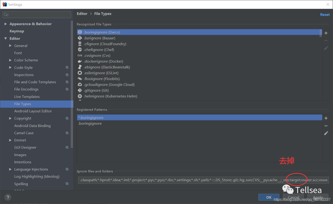 解决方法:File-->Settings-->Editor-->File Types-->右边Ignore files and folders找到target文件名去掉即可