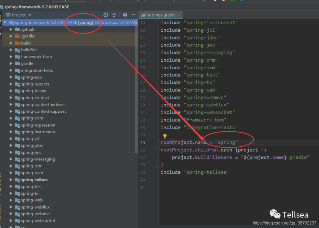 我们这里可以看到,后面的名字和项目名字不同,这里统一处理以下,将右侧的rootProject.name修改为以下值