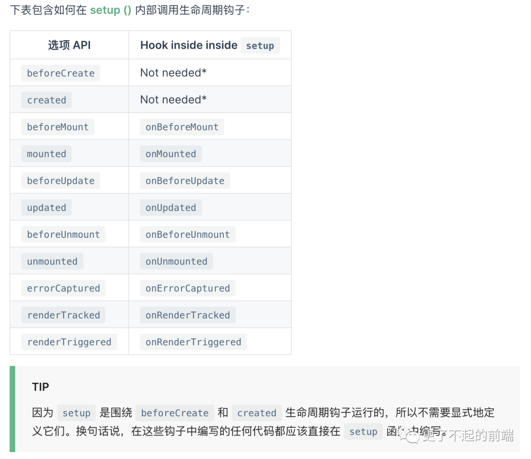 方法内,我们可以使用 Vue 3 提供的生命周期钩子将请求放到特定生命周期内,关于生命周期钩子方法与之前生命周期的对比如下: