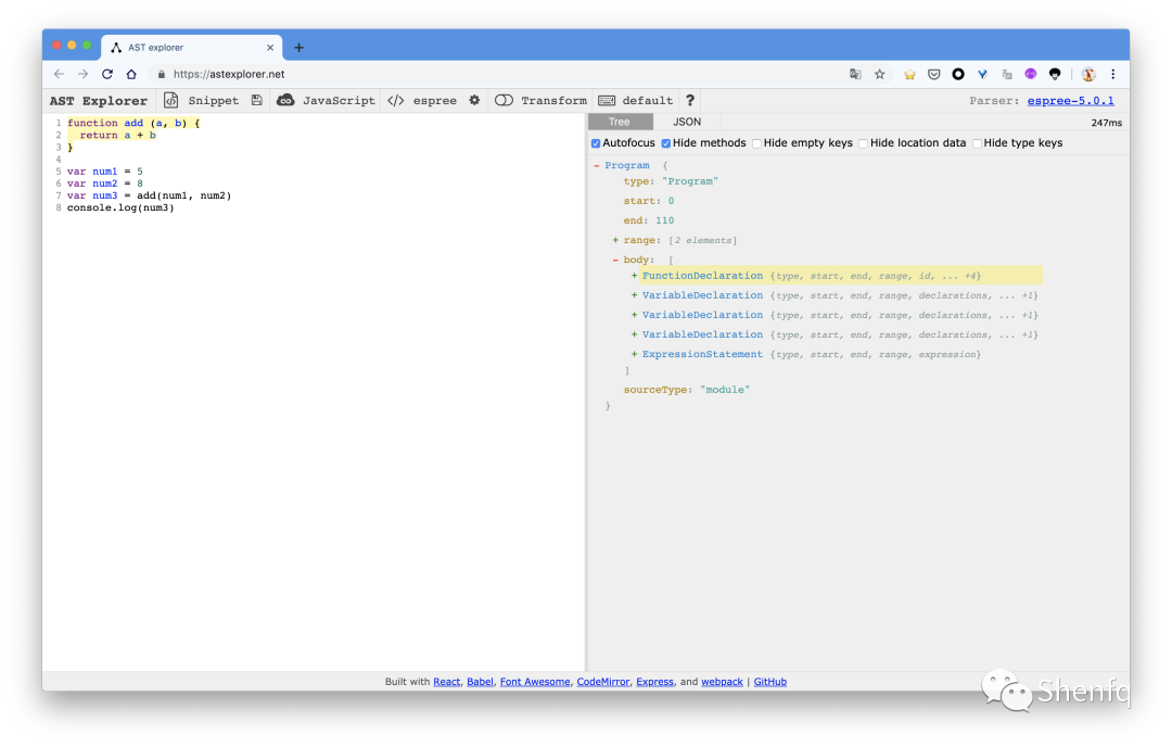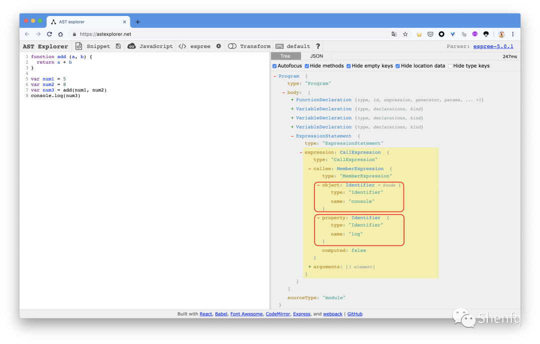 在详细讲解如何创建一个规则之前,我们先来谈谈 AST(抽象语法树)。ESLint 使用了一个叫做 Espree 的 JavaScript 解析器来把 JavaScript 代码解析为一个 AST 。然后深度遍历 AST,每条规则都会对匹配的过程进行监听,每当匹配到一个类型,相应的规则就会进行检查。为了方便查看 AST 的各个节点类型,这里提供一个网站能十分清晰的查看一段代码解析成 AST 之后的样子:astexplorer。如果你想找到所有 AST 节点的类型,可以查看 estree。
