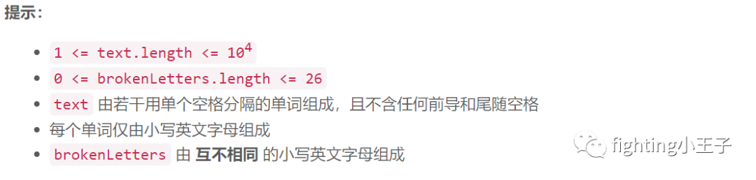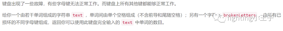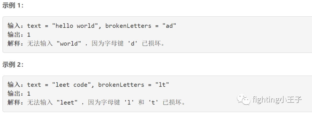 class Solution {public:bool f[27];int canBeTypedWords(string text, string br) {memset(f,false,sizeof f);for(auto &x:br){f[x-'a']=true;}int n=text.length();bool flag=false;int ans=0;for(int i=0;i<n;i++){if(text[i]==' '){if(!flag)ans++;elseflag=false;continue;}if(f[text[i]-'a']) flag=true;}if(flag==false) ans++;return ans;}};