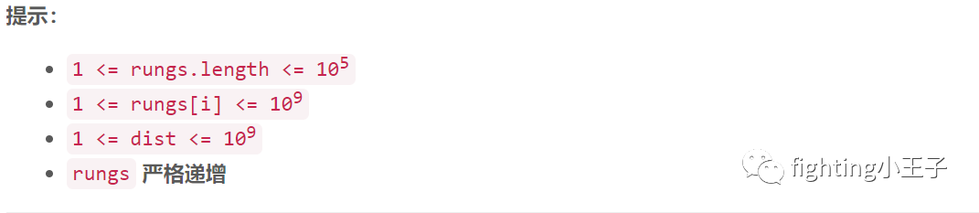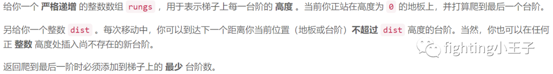 class Solution {public:int addRungs(vector<int>& rungs, int dist) {int last=0;int ans=0;for(int i=0;i<rungs.size();i++){if((rungs[i]-last)%dist == 0)ans += (rungs[i]-last)/dist - 1;elseans += (rungs[i]-last)/dist;last = rungs[i];}return ans;}};