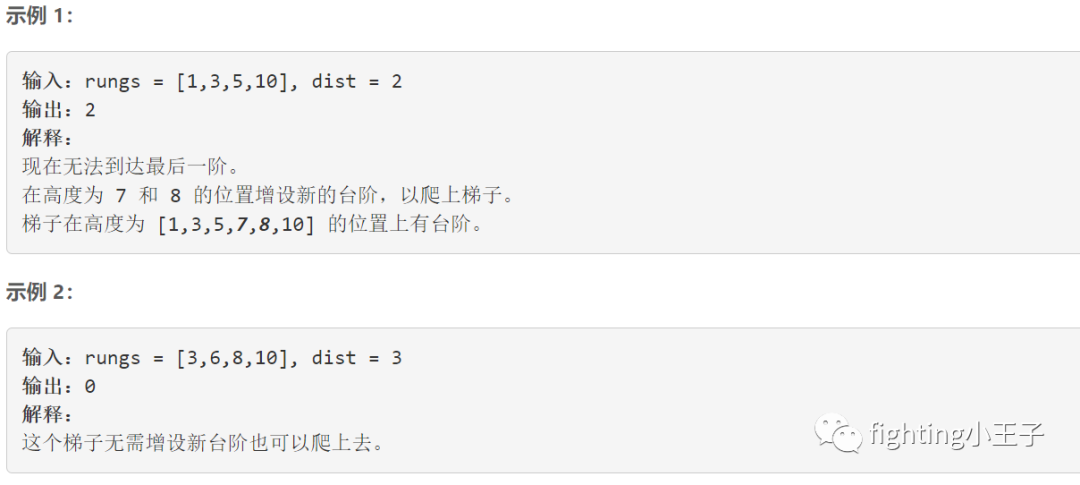 贪心。rungs序列严格递增,只要能够到的就够到,够不到的时候再加梯子就行。够不到的台阶之间加上距离/dist下取整就行。这里需要注意的是下取整操作常规是(x+n-1)/n就行,但是做题的时候遇到了n=1的情况,被卡了一下,所以我的代码里下取整操作分情况写的。
