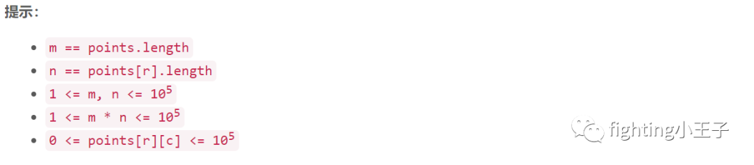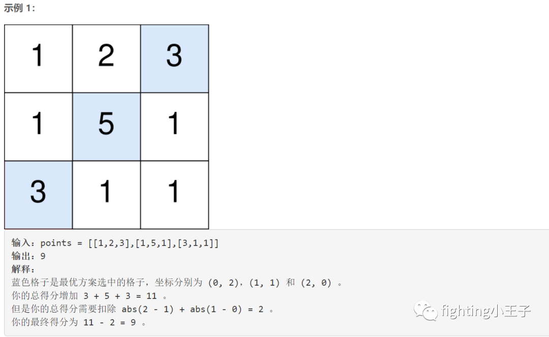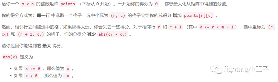 typedef long long ll;class Solution {public:long long maxPoints(vector<vector<int>>& points) {int n=points.size();int m=points[0].size();vector<ll> dp(m+10,0),work(m+10,0);for(int i=1;i<=n;i++){long long left_max=0;for(int j=1;j<=m;j++){left_max = max(left_max-1 , dp[j]);work[j] = max(work[j],left_max);}long long right_max=0;for(int j=m;j>0;j--){right_max = max(right_max-1 , dp[j]);work[j] = max(work[j] , right_max);}for(int j=1;j<=m;j++)work[j] += points[i-1][j-1];dp = work;}long long ans=0;for(int i=1;i<=m;i++)ans = max(ans , dp[i]);return ans;}};