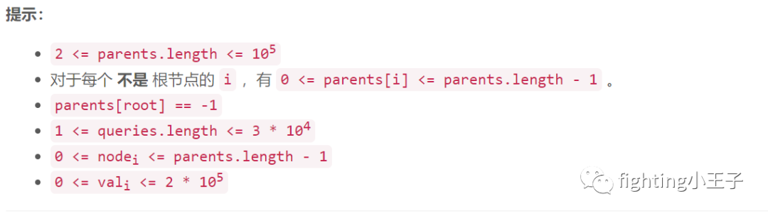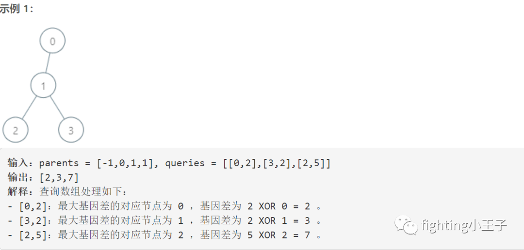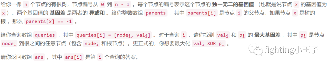 typedef pair<int,int> pii;const int N=20; //10^5 二进制表示不超过20位struct node{int cnt=0;struct node *child[2]{};};void dfs(int u,vector<vector<int>>& children,vector<vector<pii>> &queries,node *trie,vector<int>& ans){node *p=trie;for(int i=N-1;i>=0;i--)//把节点u插入字典树{int next = (u & (1 << i)) ? 1 : 0;if(!p->child[next]){p->child[next]=new node();}p=p->child[next];p->cnt++;}for(auto &q:queries[u]){int val=q.first,id=q.second;p=trie;int tmp=0;for(int i=N-1;i>=0;i--){int next = (val & (1 << i)) ? 0 : 1;if(p->child[next]!=NULL && p->child[next]->cnt!=0){p = p->child[next];tmp = tmp xor (1 << i);}else{if(p->child[next xor 1] == NULL){p->child[next xor 1]=new node();}p = p->child[next xor 1];}}ans[id] = tmp;}for(auto &x:children[u])dfs(x,children,queries,trie,ans);p = trie;for (int i=N-1;i>=0;i--){int next = (u & (1 << i)) ? 1 : 0;p = p->child[next];p->cnt--;}}class Solution {public:vector<int> maxGeneticDifference(vector<int>& parents, vector<vector<int>>& query) {int root;int n=parents.size(),q=query.size();vector<int> ans(q);vector<vector<int>> children(n);for(int i=0;i<n;i++)if(parents[i]==-1)root=i;elsechildren[parents[i]].push_back(i);vector<vector<pii>> queries(n);for(int i=0;i<q;i++){int id=query[i][0],val=query[i][1];queries[id].push_back({val,i});}node *trie = new node();dfs(root,children,queries,trie,ans);return ans;}};