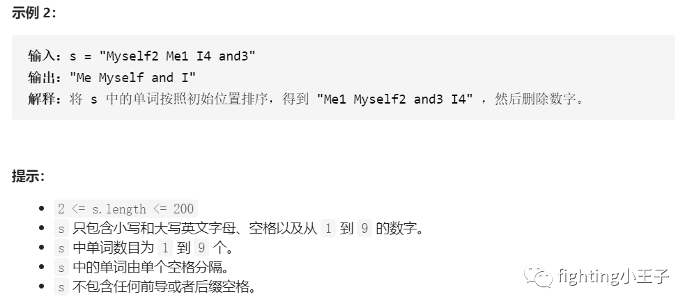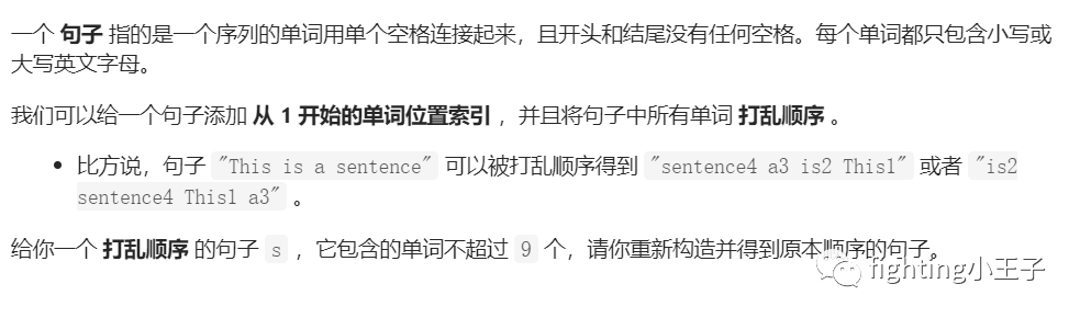 class Solution {public:string word[10]={""};string sortSentence(string s) {int i=0;string tmp="";while(i<=s.length()){if(s[i]==' ' || i==s.length()){if(tmp.length()>0){int id=tmp[tmp.length()-1]-'0';word[id]=tmp.substr(0,tmp.length()-1);}tmp="";}else tmp+=s[i];i++;}string ans;bool block=false;for(int i=1;i<10;i++)if(word[i].length()>0){if(block) ans+=" ";ans+=word[i];block=true;}return ans;}};