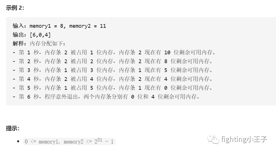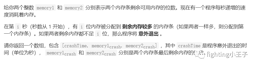 class Solution {public:vector<int> memLeak(int memory1, int memory2) {long long i=1;while(i<=memory1 || i<=memory2){if(memory1>=memory2) memory1-=i++;else memory2-=i++;}vector<int> ans;ans.push_back(i);ans.push_back(memory1);ans.push_back(memory2);return ans;}};
