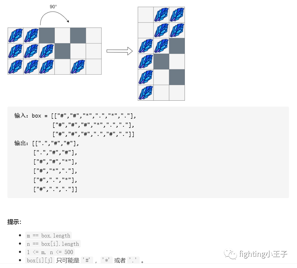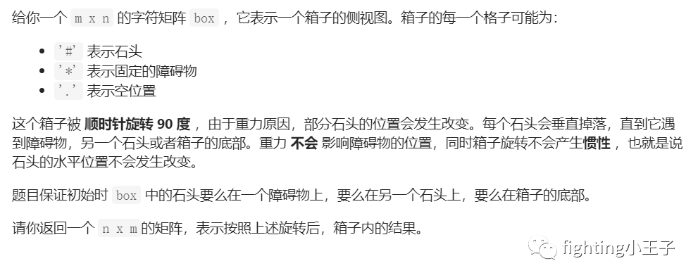 class Solution {public:vector<vector<char>> rotateTheBox(vector<vector<char>>& box) {int n=box.size(),m=box[0].size();vector<vector<char>> ans(m,vector<char>(n));for(int i=0;i<n;i++)for(int j=0;j<m;j++)ans[j][n-1-i]=box[i][j];for(int i=0;i<n;i++)//扫描每列{int j=m-1;while(j>0){while(j>0 && ans[j][i]!='.') j--;if(j<=0) break;int t=j-1,cnt=0;while(t>=0 && ans[t][i]!='*'){if(ans[t][i]=='#') cnt++;t--;}int k=j;for(k;j-k<cnt;k--)ans[k][i]='#';for(k;k>t;k--) ans[k][i]='.';if(t<0) break;else j=t;}}return ans;}};