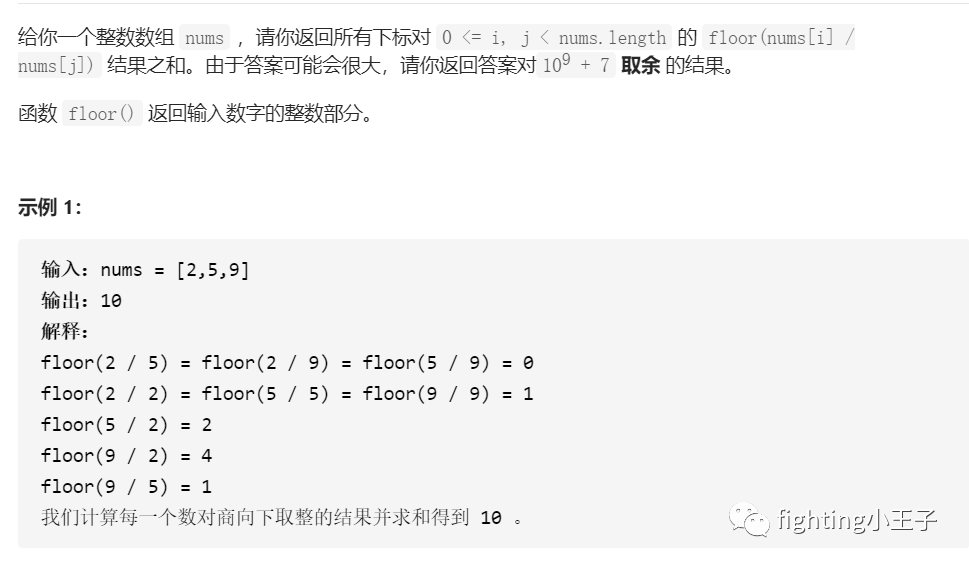 typedef long long ll;const int N=100010,M=1e9+7;class Solution {public:int cnt[N]={0};int sumOfFlooredPairs(vector<int>& nums) {int ans=0;for(auto &x:nums) cnt[x]++;for(int i=1;i<N;i++) cnt[i]+=cnt[i-1];for(int i=1;i<N;i++)for(int j=1;j*i<N;j++){int l=j*i,r=min(N-1,(j+1)*i-1);int sum=(ll)(cnt[r]-cnt[l-1])*j % M ;ans=(ans+sum*(cnt[i]-cnt[i-1])) % M;}return ans;}};