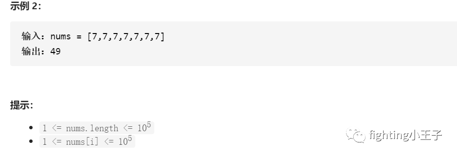 nums中每个数都在1-10^5之内,咱们可以直接对1-10^5全扫描一遍。也可以只扫描nums的数,这样时间复杂度会比1-10^5全扫更低些,后面两个版本代码都提供了,可以对比一下。