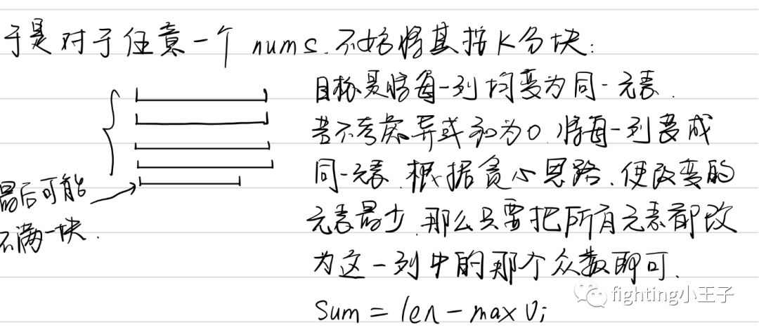 class Solution {public:const int M=1024; //nums[i] 异或 nums[j] 最大值为1023const int INF=1e8; //无穷大int s[1024];int minChanges(vector<int>& nums, int k) {int n=nums.size();int m=(n+k-1)/k;vector<vector<int>> f(k+1,vector<int>(M,INF));f[0][0]=0;int sum=0,minv=INF;for(int i=1;i<=k;i++){memset(s,0,sizeof s);int len=m;if(n%k && n%k < i) len--;for(int j=0;j<len;j++)s[nums[j*k+i-1]]++;int maxv=0;for(int j=0;j<1024;j++)if(s[j])maxv=max(maxv,s[j]);sum+=len-maxv,minv=min(minv,maxv);for(int j=0;j<1024;j++)for(int u=0;u<len;u++){int x=nums[u*k+i-1],cost=len-s[x];f[i][j]=min(f[i][j],f[i-1][j^x]+cost);}}return min(sum+minv,f[k][0]);}};
