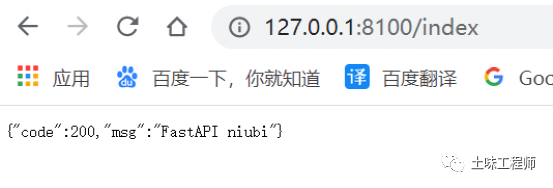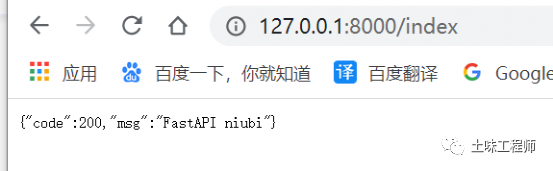 from fastapi import FastAPIapp = FastAPI()@app.get("/index")async def index():return {'code': 200, 'msg': 'FastAPI niubi'}