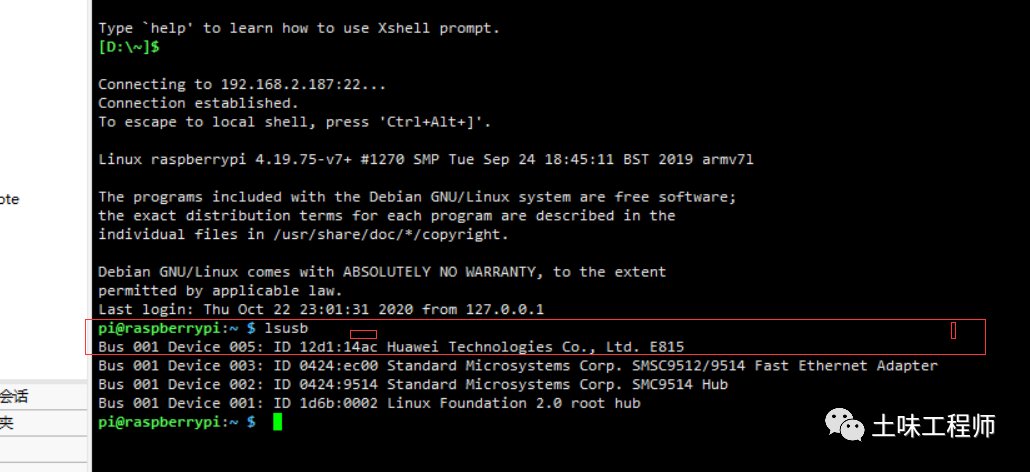 接下来把它插到我的树莓派里面,用Xshell链接我的树莓派,输入