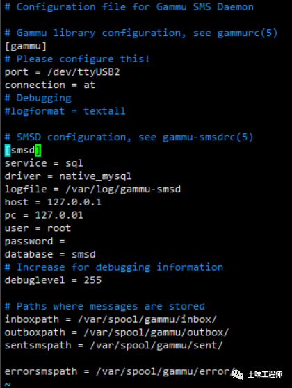 安装完成后开始配置smsd,配置文件在/etc/gammu-smsdrc文件里