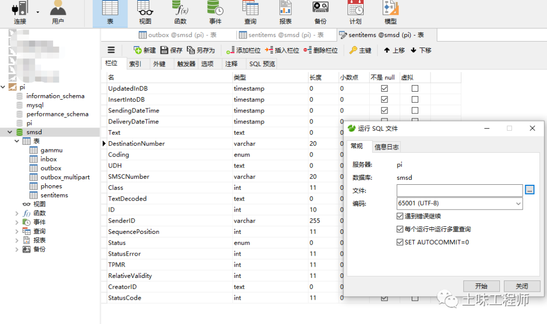 先用数据库管理工具连接上树莓派的数据库,自己创建一个smsd的数据库,右键运行自己刚刚创建的mysql.sql,就会生成如下6张数据表。