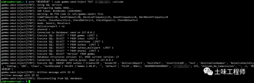 echo "测试测试" | sudo gammu-smsd-inject TEXT *********** -unicode