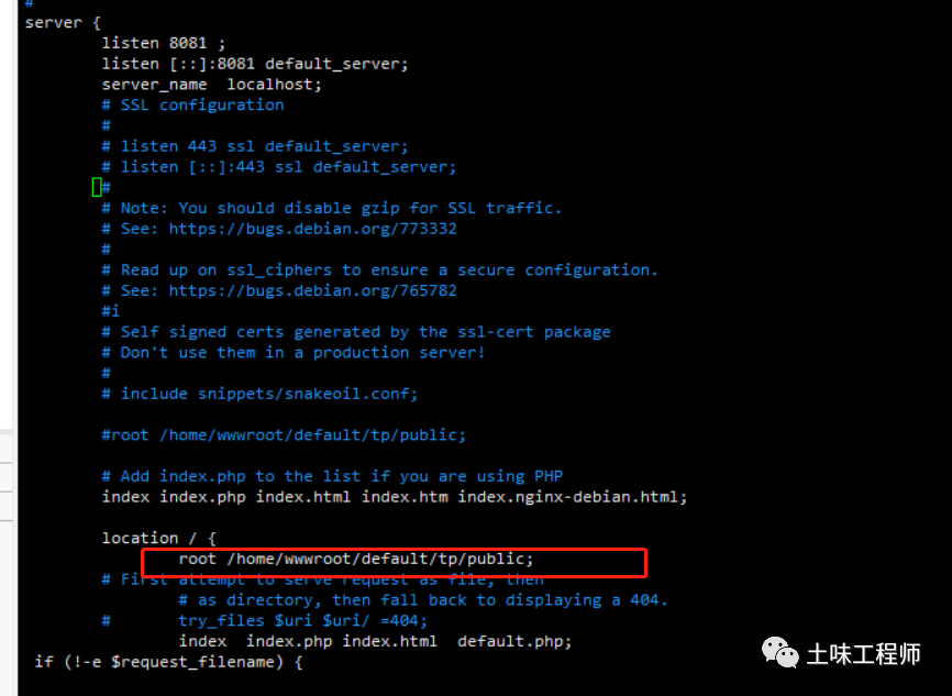 接下来我不会讲的很详细,因为有很多的基础软件并不是所有的人都有安装,不同的系统环境差异很大,不会完全跟我一样的,我只说一个基础的流程。有很多坑等着大家去踩,需要安装PHP7.3,nginx,frp内网穿透。安装完成后,配置Nginx,我的Nginx的配置如下,项目文件目录是/home/wwwroot/defalut/tp。我在最后会把我的项目的代码分享出来,大家可以设置自己的项目位置,nginx也要配置正确。监听8081是因为我把树莓派的本地的8081映射到外网的服务器上了,然后外网的服务器也有Nginx。再使用域名解析。